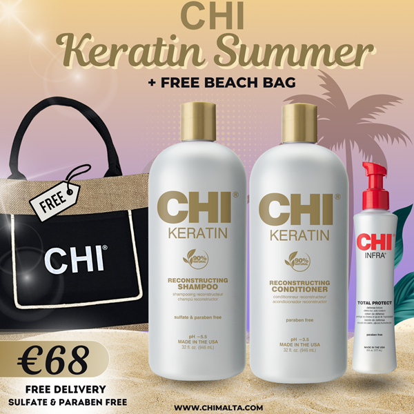 Elevate your summer hair care with the CHI Summer Keratin set. This exclusive collection includes CHI Keratin Shampoo and Conditioner (946ml each) designed to nourish all hair types, restoring health and adding radiant shine. The gentle, natural formula effectively protects and repairs dry, damaged, curly, straight, or chemically treated hair. Plus, enjoy a free CHI Beach Bag and Total Protect (177ml) to keep your hair shielded from everyday stressors. Embrace the perfect regimen for vibrant, smooth hair all season long.