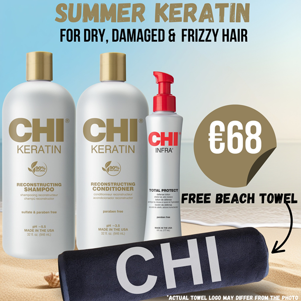 Enjoy healthier, shinier hair this summer with the CHI Summer Keratin 2025 set. It includes a CHI Keratin Shampoo and Conditioner (946ml each) made with natural ingredients suitable for all hair types. Protect your hair with the Total Protect spray (177ml) and receive a free CHI beach towel to complete your summer essentials. Perfect for maintaining vibrant, well-nourished hair all season.