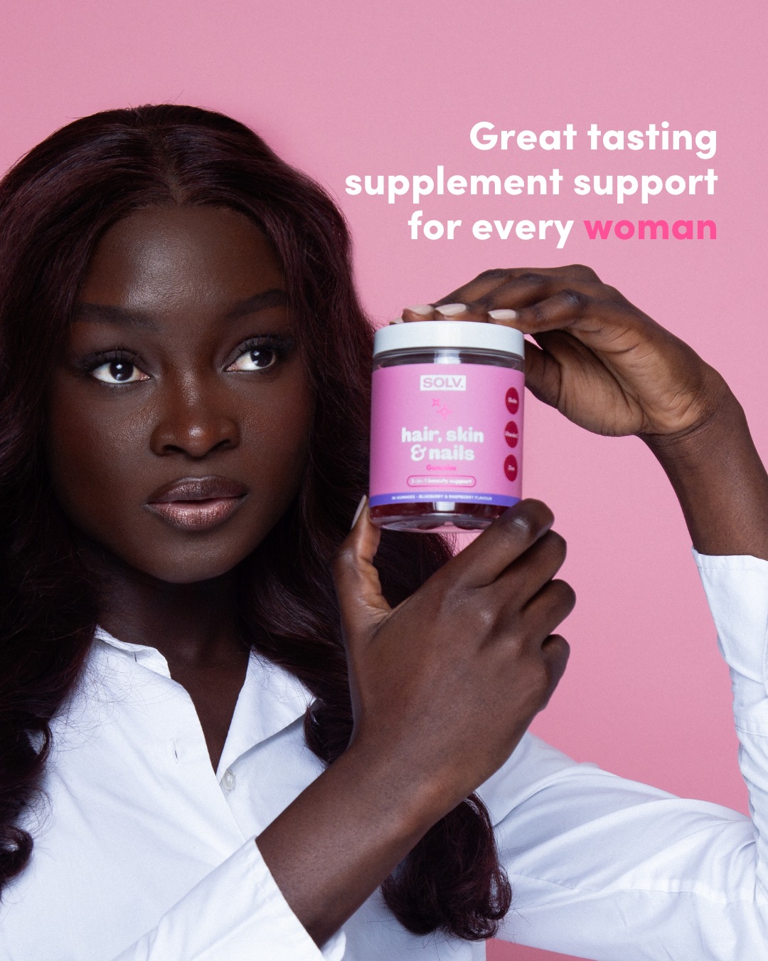 SOLV Hair Skin & Nails Gummies offer a tasty and convenient way to support your natural beauty from within. Each gummy delivers vital nutrients including Biotin, Zinc, and Vitamins E and C, tailored to strengthen brittle nails, enhance hair growth, and promote radiant, youthful skin.